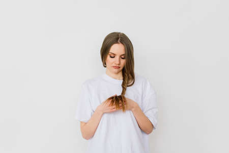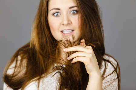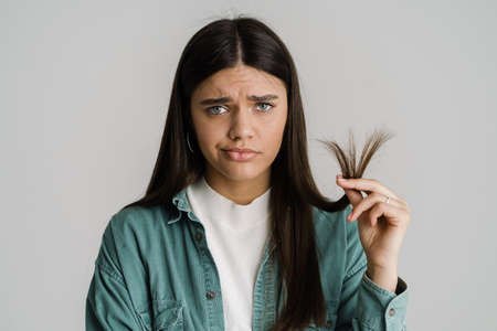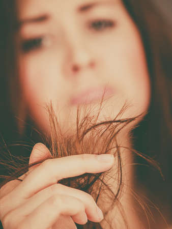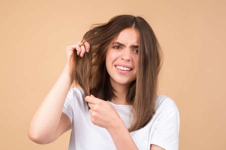 Young woman worried about dry hair, damaged hair and split ends. Hair problems and hair care concept.