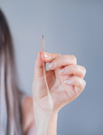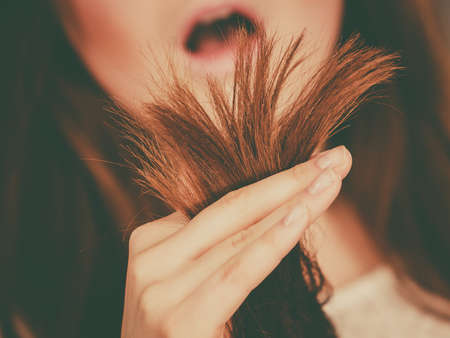 Close up view of unrecognizable woman holding damage hair with split ends with selective focus and blurred background