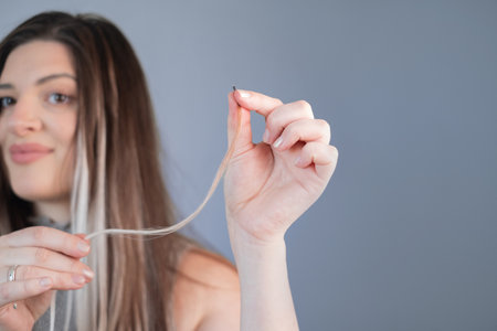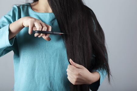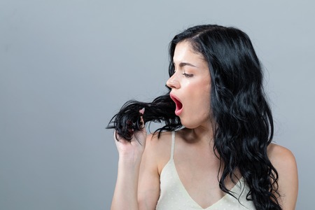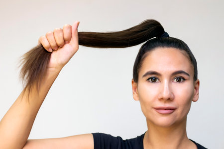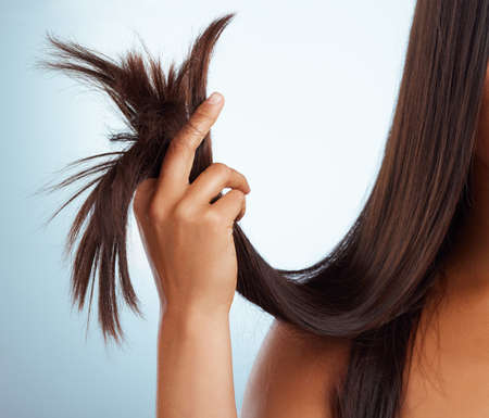 Closeup of unknown mixed race woman holding her unhealthy hair against a grey background. Hispanic females hands holding her split ends