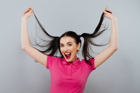 Portrait of a cute teenage girl looking at her hair. Studio portrait on a pink background. Beauty, hairstyle.