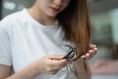 Woman holding a clump of fallen hair in her hand, experiencing hair loss, concerns about alopecia, and scalp issues potentially related to stress and health problems
