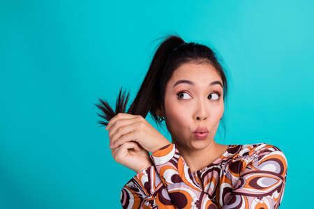 Photo portrait of pretty young girl look amazed hair tail wear stylish colorful clothes isolated on cyan color background