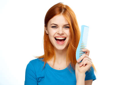 Picture of white hair comb fixed on a redhead woman head in a beauty salon, hairstyle and beauty concept.