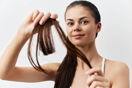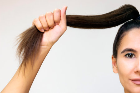 Adult Latina woman suffers from her long, damaged straight hair and split ends due to dryness and dehydration