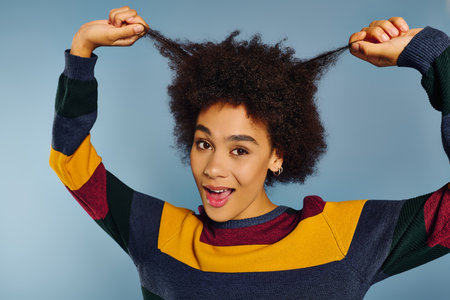 A young woman joyfully plays with her curly hair, highlighting her vibrant personality.