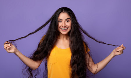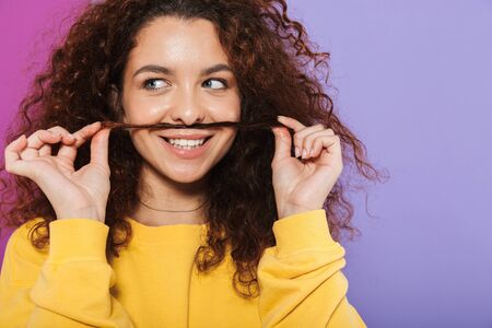 Image of joyous happy curly woman swearing casual clothes smiling and having fun with her hair isolated over purple background