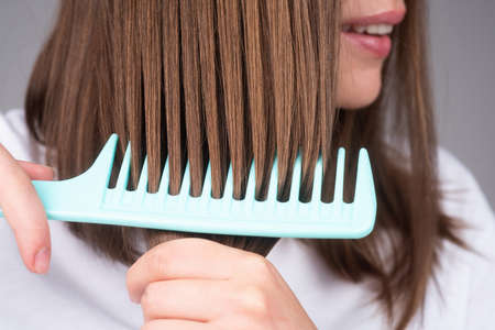 Haircare concept. Female hand combing brown hair with wooden comb on blue