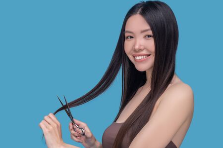 Portrait of attractive Asian woman measuring her hair before cutting for donation. Usable hair can turn your long locks into free or low-cost wigs for people with cancer.