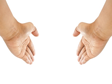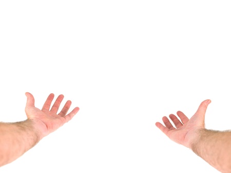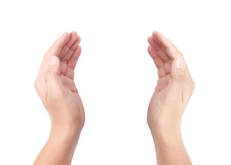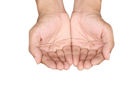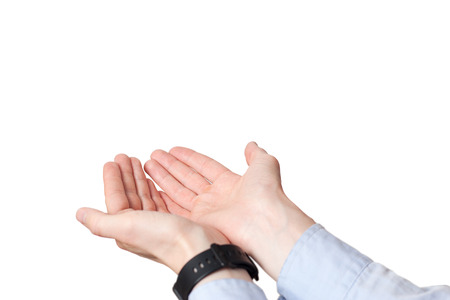 The palms are in a holding, offering or giving position isolated on white background. Open palm gesture.