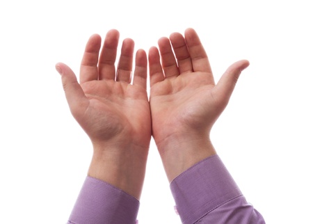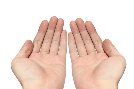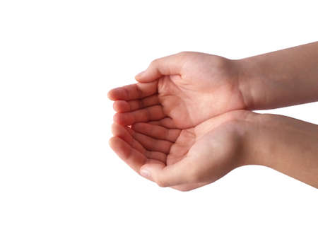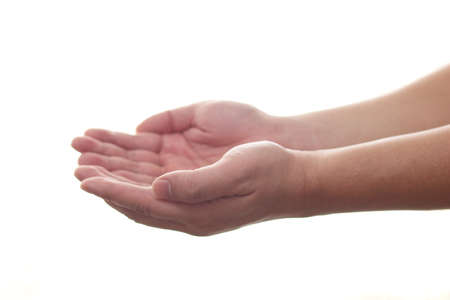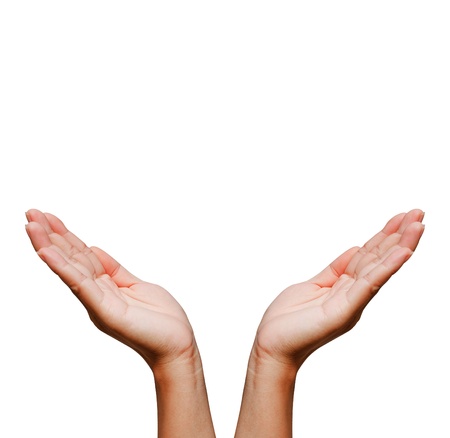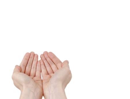 Two cupped hands are held open, palms facing upwards, against a stark white background.