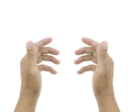 Young man offer hand and holding nothing. hands as if holding something isolated on white