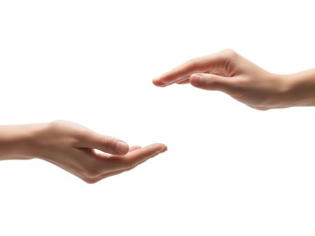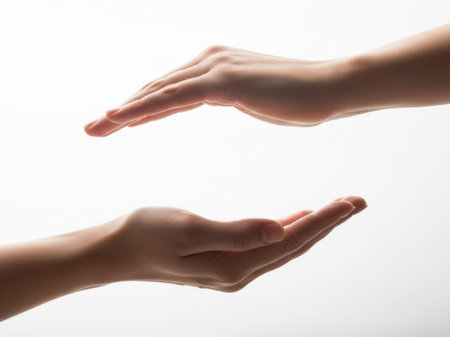 This image features two human hands reaching out towards each other against a clean, white background. The hands are positioned centrally in the frame, with soft lighting highlighting their features. The image is ideal for use in contexts that require a sense of connection or interaction.