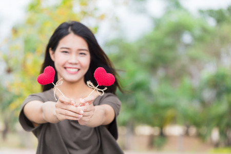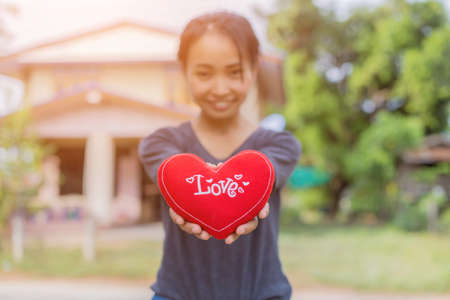 giving love in valentine's day , Asian woman hand hold give beautiful red heart sweet loving symbol of take care or charity help to you.