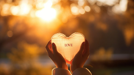Sunlight shines on the tender gesture of an elderly hand holding a plush heart, evoking a nostalgic feeling of care and affection, banner