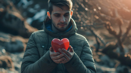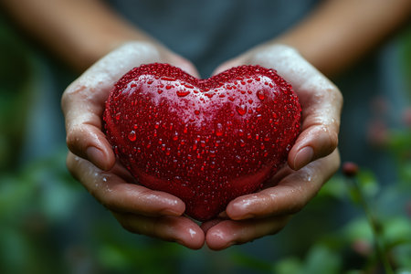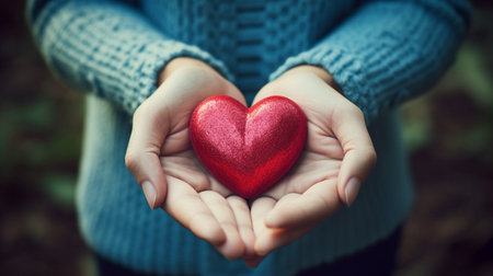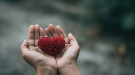 A close-up image showcasing hands delicately holding a soft red heart, symbolizing love and emotional connection, perfect for themes of affection and kindness.
