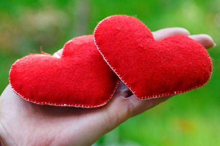 Hand holding two red hearts on grass in park. Happy, Love, Valentines day idea, sign, symbol, concept.