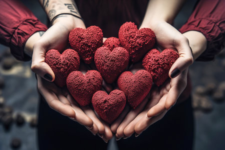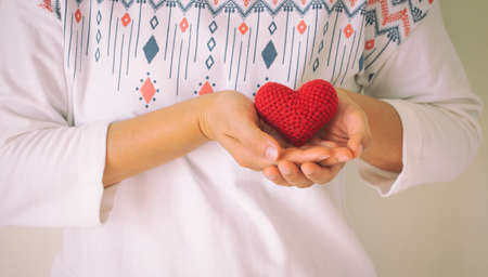 Woman hands tenderly holding a red knitted heart, symbolizing love, warmth, and care. A perfect image for themes of Valentine's, charity, and compassionate giving