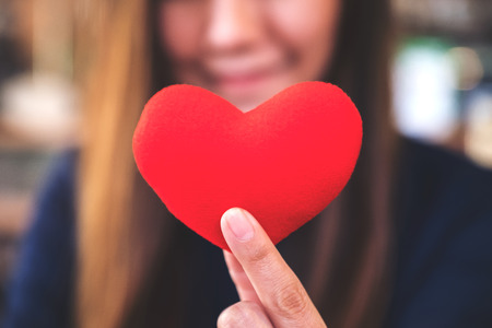 Closeup image of a happy woman holding a red heart sign with feeling in love