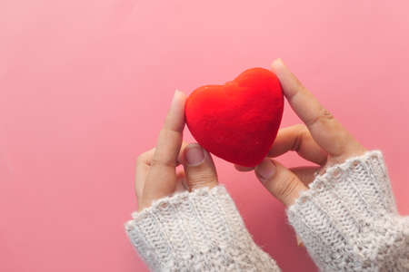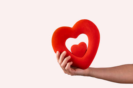 Valentine's day concept. a womans hand holds a red heart. Heart health care medical cardiovascular disease concept and organ donor donation for life