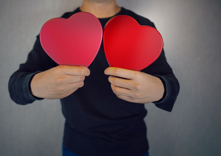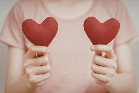 A person holding two red heart-shaped objects in each hand, symbolizing love and affection.