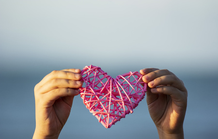 Red heart in the palm of your hand against the backdrop of the reflections of the sea. selective focus.