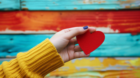 Red heart in woman's hand on colorful background. Valentine's day concept