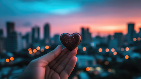 A hand holds a heart-shaped chocolate against a stunning sunset backdrop of an urban skyline, creating a romantic and warm atmosphere.