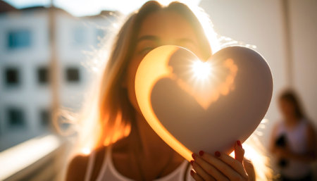 A close-up of a woman's hand holding a glowing heart symbolizing love and care for the human body