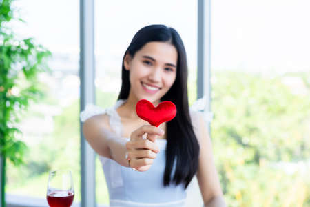 Valentine's day concept, Smiling Happy Asian young female sitting at a table food Abstract blur with focus show holding small a red hearts shaped at in the restaurant background