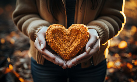 Knitted Heart in Hands Against Autumn Background, Symbol of Warmth, Love, and Handmade Crafts