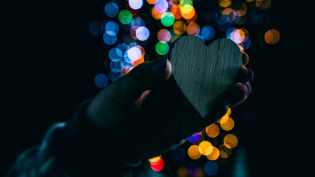 Close-up of Hands Tenderly Holding a Red Glittering Heart with Soft-Focused Lights in Background.