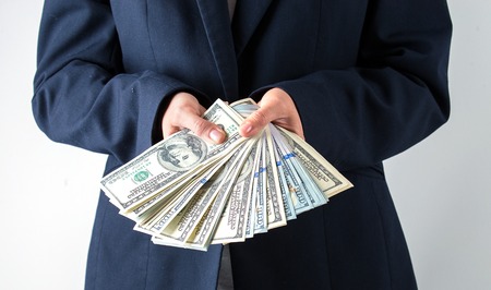 dollars in the hands. Businesswoman in gray shirt holding. a fan of money