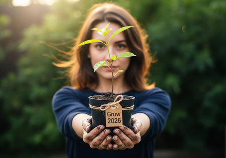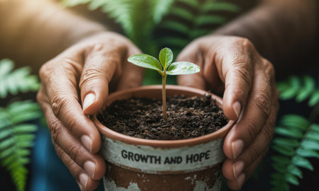 Adult hands tenderly hold a small pot with a young green seedling emerging from soil. the pot features growth and hope text, symbolizing new beginnings and environmental care.