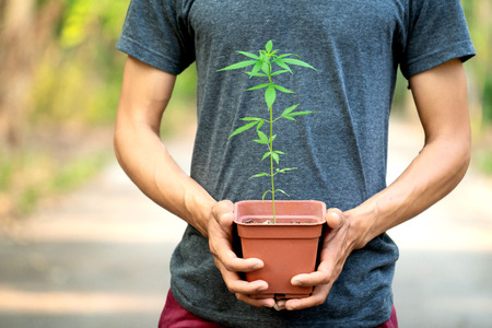 Farmer hands holds baby cannabis plant in farm.