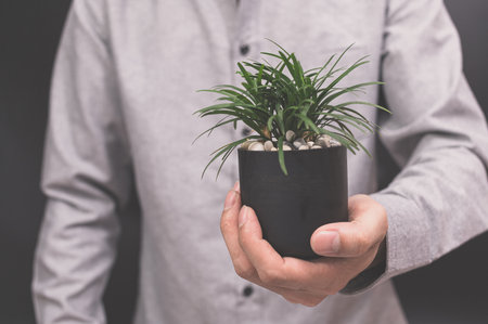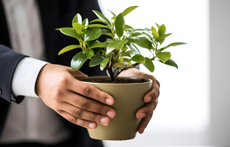 success businessman holding vase plant,tree,front view,filter effect