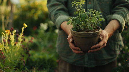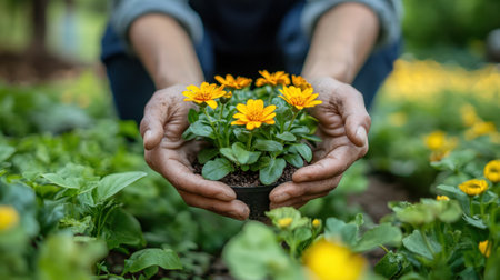 A gardener gently holds a small pot of bright yellow flowers showcasing a blend of care and dedication. Surrounded by a sea of greenery the scene reflects a delightful spring day emphasizing the beauty of nature and the joy of nurturing plants
