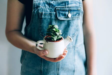 Young woman holds a pot with little succulents against a white wall in her house.