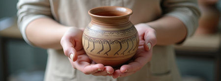 Clay pot in the hands of a young woman, close-up