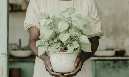 hands gently holding a lush green potted plant in a cozy indoor setting