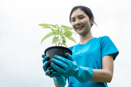 Image of an Asian woman In the concept of planting trees for the environment