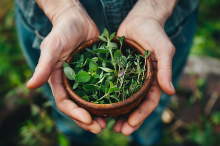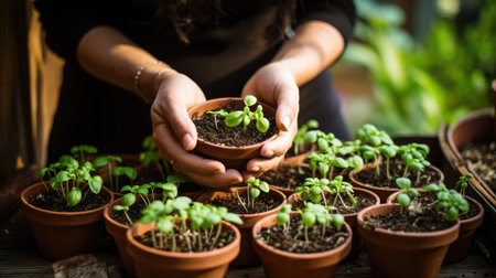 A hand gently holding a small terracotta pot, with fresh herbs growing inside, ready to be placed in a kitchen garden.