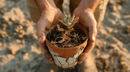 A close-up of hands holding a dying plant in a cracked pot, symbolizing the harsh conditions of the dry season.