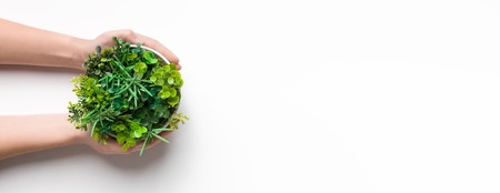 Girl holding potted plant against blurred green nature background. Save world, Environment day, Save environment, Earth day.
