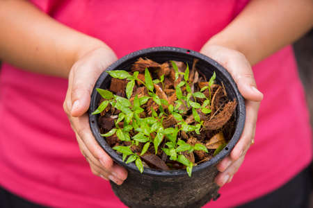 Young man's hand held a small seedling and prepared it to the young woman in preparation for planting, Plants help increase oxygen in the air and soil, Loving the Earth and Conserving the Environment