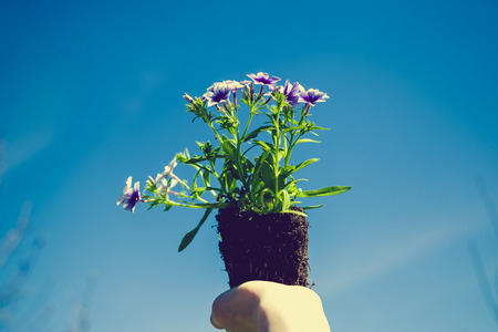 Children's hands hold a blue flower for planting