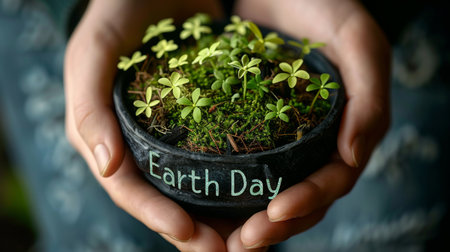 Hands holding a pot with a green plant and the inscription Earth Day