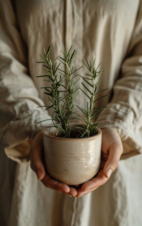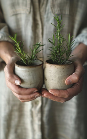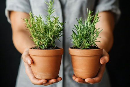 A woman with a light gray outfit is holding two clay pots, each containing a lush rosemary plant. The background features greenery, enhancing the garden atmosphere.