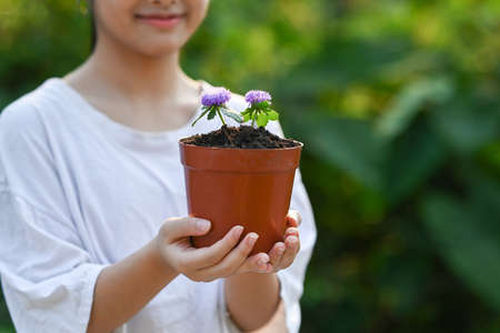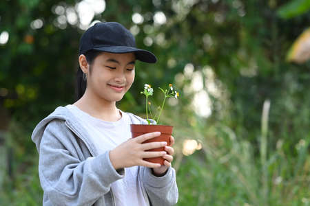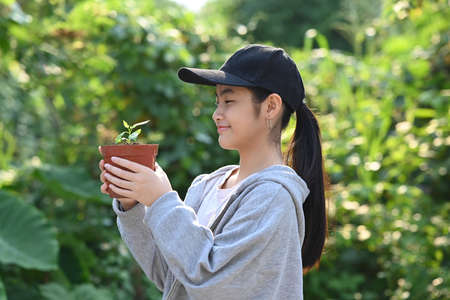 Smiling asian girl holding potted plant in hands against blurred green nature background on a sunny day
