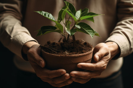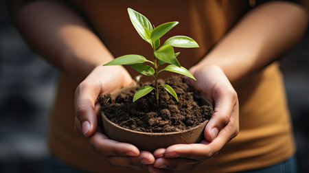Hand holding seedling in flower pot for new plant growth generated by artificial intelligence