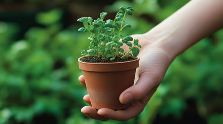 Photo of a person holding a small potted plant against a blurred green background